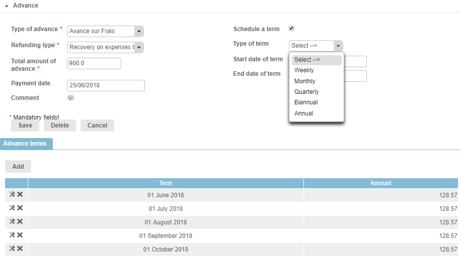 The HR folder allows you to record payment of advances via the “Action > Add an advance” button: