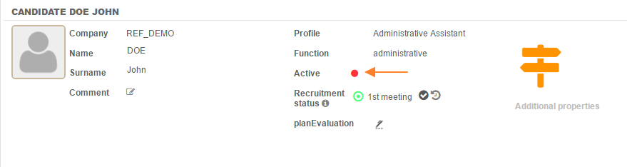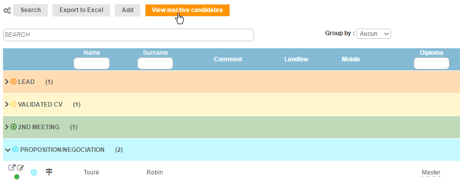 Candidates' profiles can be "activated" or "deactivated". For this, click on the "Modify" icon on the line corresponding to the candidate then click on the round green button next to "active". The button turns red, meaning the candidate is changed to an inactive status.