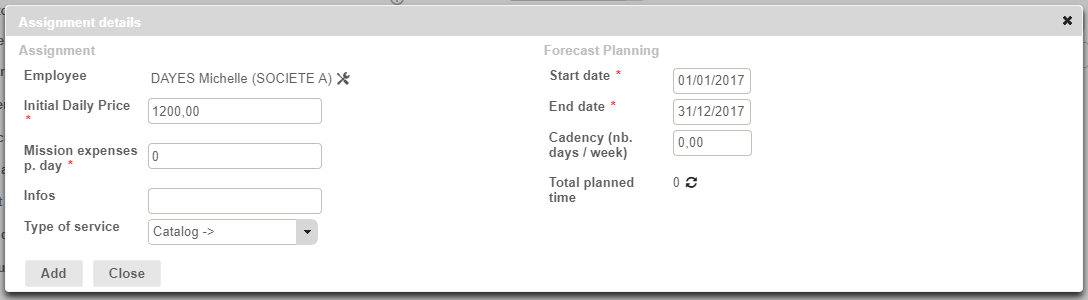 - Mission expenses p. day: by default, you can specify a fixed amount per day. This amount will impact only initial and forecasted plannings.