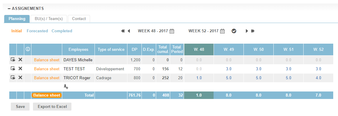 - If the contract is launched, Fitnet Manager creates a "Forecasted" planning. 2 plannings are created beside: Initial & Completed (all two at zero).