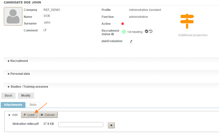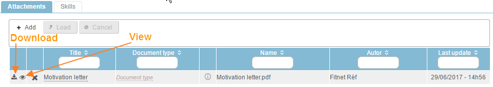 To add attachments to candidates' details, click on the "Modify" icon" on the candidate line. Below the details, on the "Attachments" tab, click on "+ Add". A window opens; select the file. You can then delete the selected file by clicking on the delete icon "x", undo the operation by clicking on "undo" or upload the file by clicking on "upload".