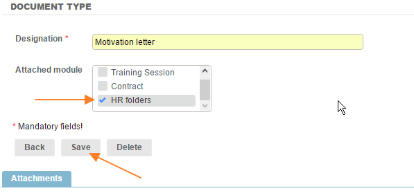 Configuration > General > Documents type > Add, attach to the "HR folders" module.