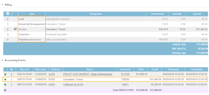 If the PIVOT = Type of service, at the time of invoice (change from Invoice open to Saved Invoice (or Proforma Invoice if the setting is enabled), the Type registered on the invoice line will be the Type of Service filled in on the object invoiced (assignment / deliverables).