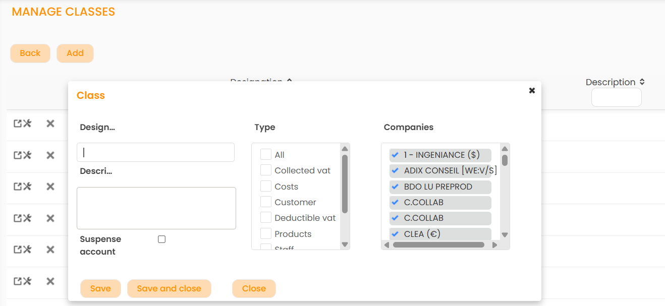 - Companies : the choice of the company makes it possible to choose the companies to which the classes are attached (by default, they are all checked). Accounts can be defined at the company level, but the configuration can be expanded to several.