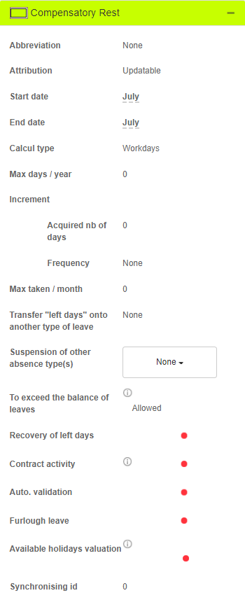 When this feature is activated, the system will automatically create a new type of leave in the Configuration (Configuration > Activities > Types of leaves). The Compensatory rest Type of leave is pre-configured but you can customize it. If you need help to configure this type of leave, please read this article.
