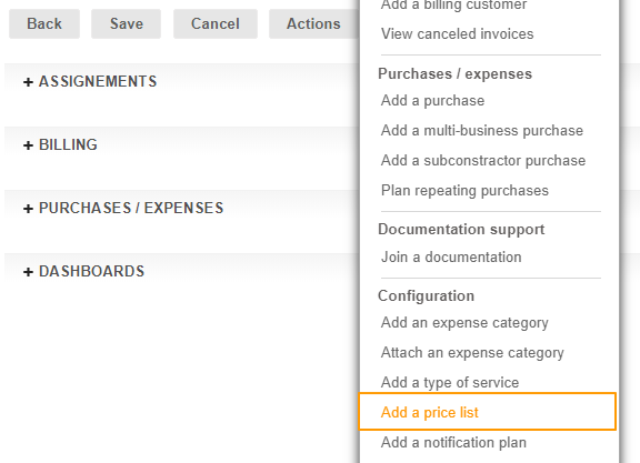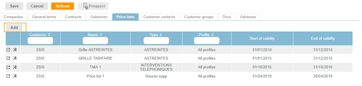 - From the Customer's sheet > Actions button > Add a price list (you can consult the existing price lists in the dedicated tab)
