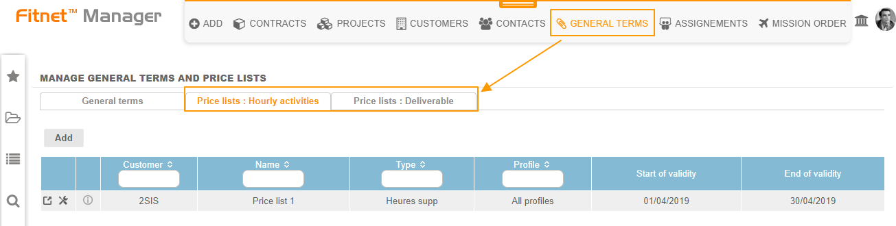 - From the Contracts menu > General Terms > Price lists
