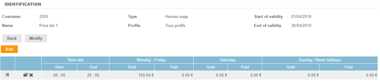 Once the price list is saved, it will be necessary to create the hourly rates (in the same screen, via the button "Add"):