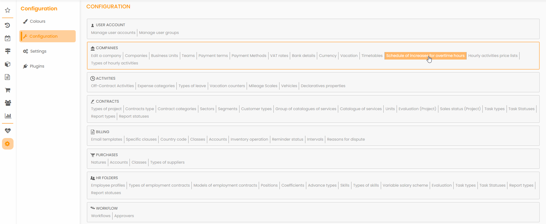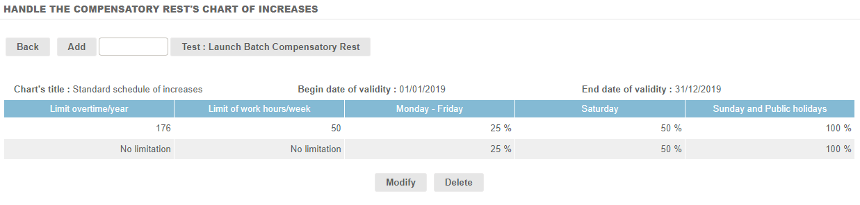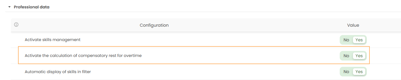 To create schedules of increases, you must first check that the "Activate the compensatory rest's calculation of the overtime" feature is activated in the Settings > HR Folders > Professional data.