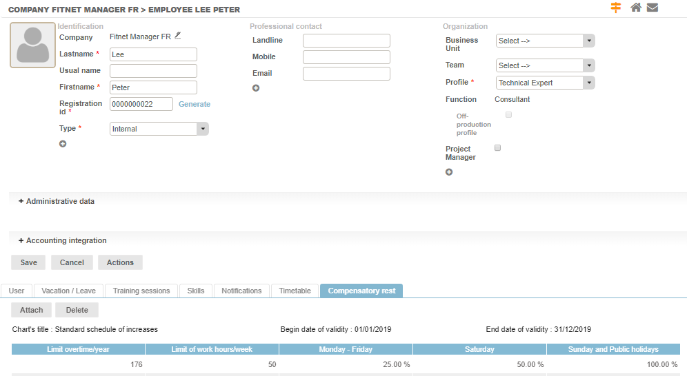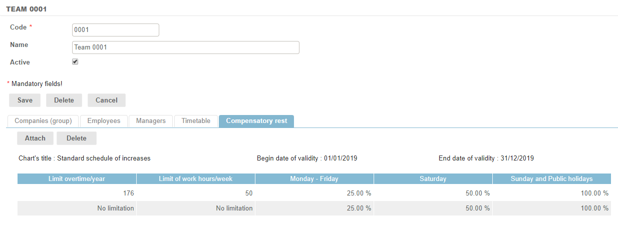 At the level of the employee, you can attach a schedule of increases directly from the Employee's sheet (HR Folders module > Employees > Select employee > Compensatory rest tab).