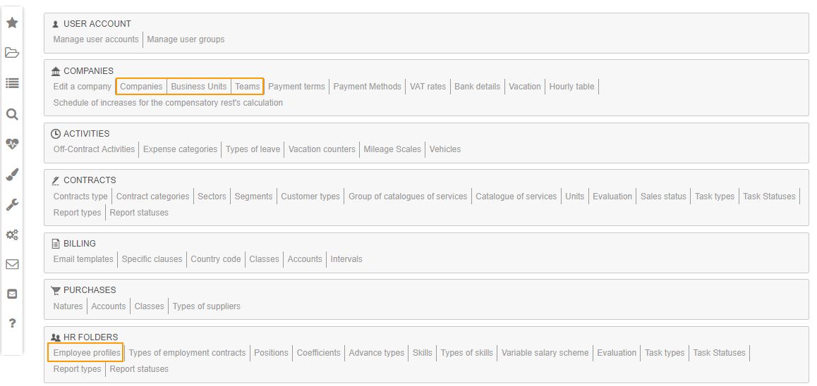 At the level of the Company / BU / Team / Employee's Profile, go to the Configuration: