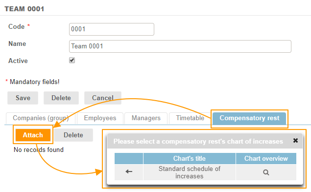 You can attach a schedule of increases from the Compensatory rest tab. When you click on "Attach", the list of created schedules appears and you can select the desired one by clicking it.