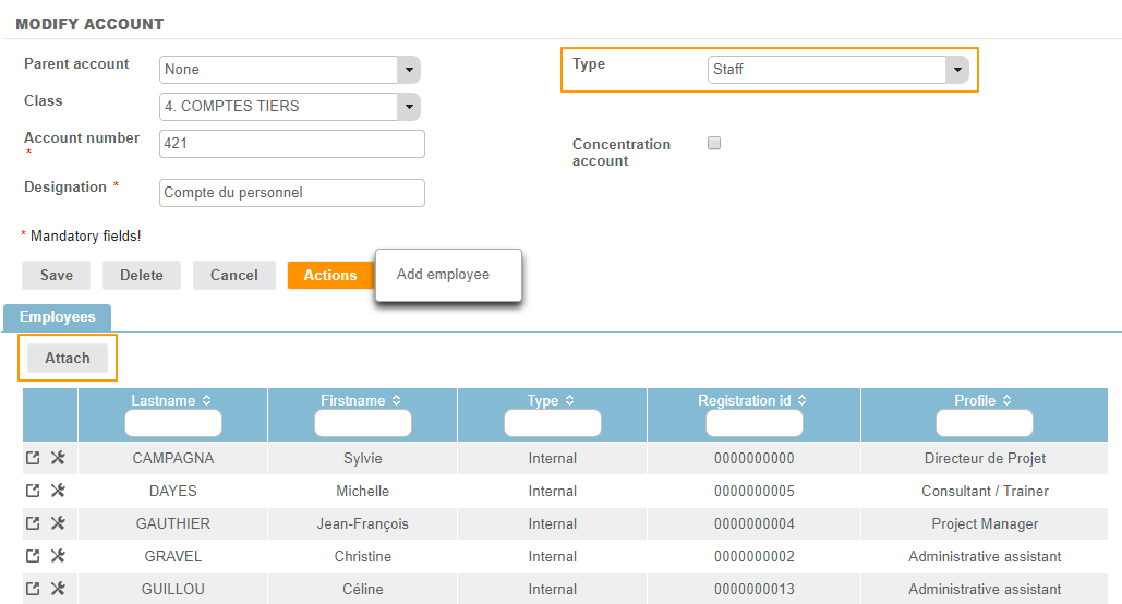 From the Configuration menu > Purchases > Accounts, it is possible to add the Employee(s) attached to the "Staff" type account number.