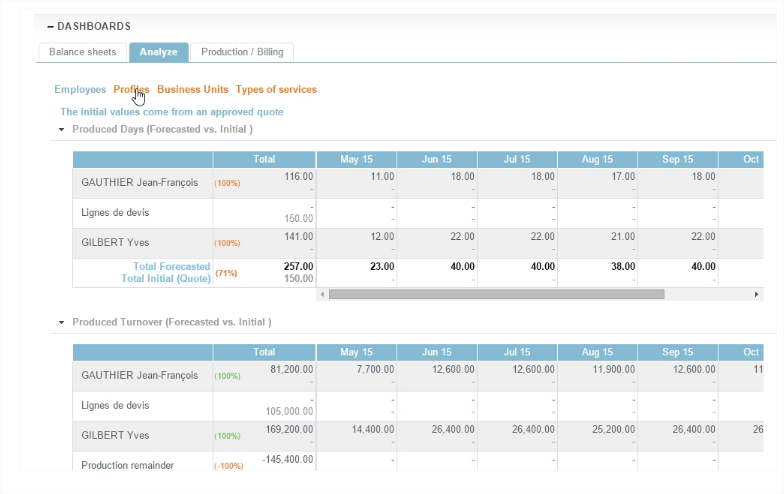 In each contract an "Analysis" tool provides a real-time comparison between the Initial Planning and the Completed Planning.
