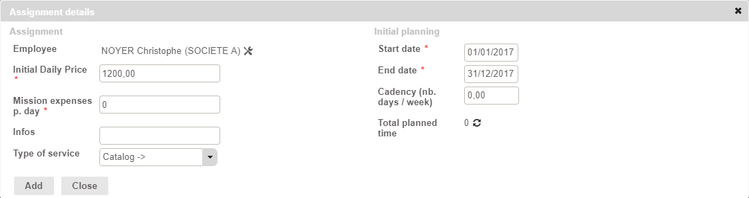 When adding a resource to the Planning an "Assignment Details" pop up enables you to enter the information related to the intervention: