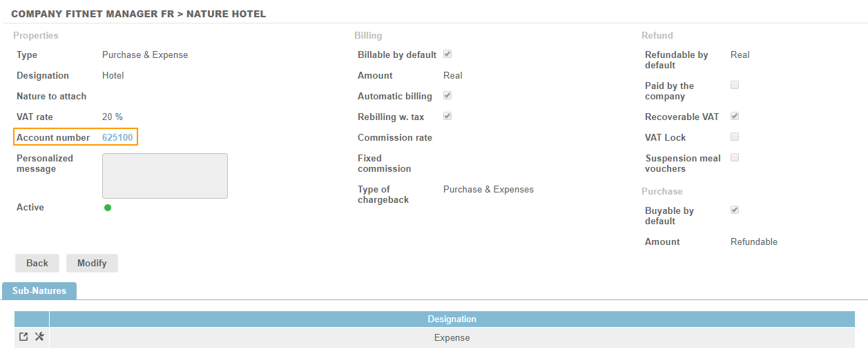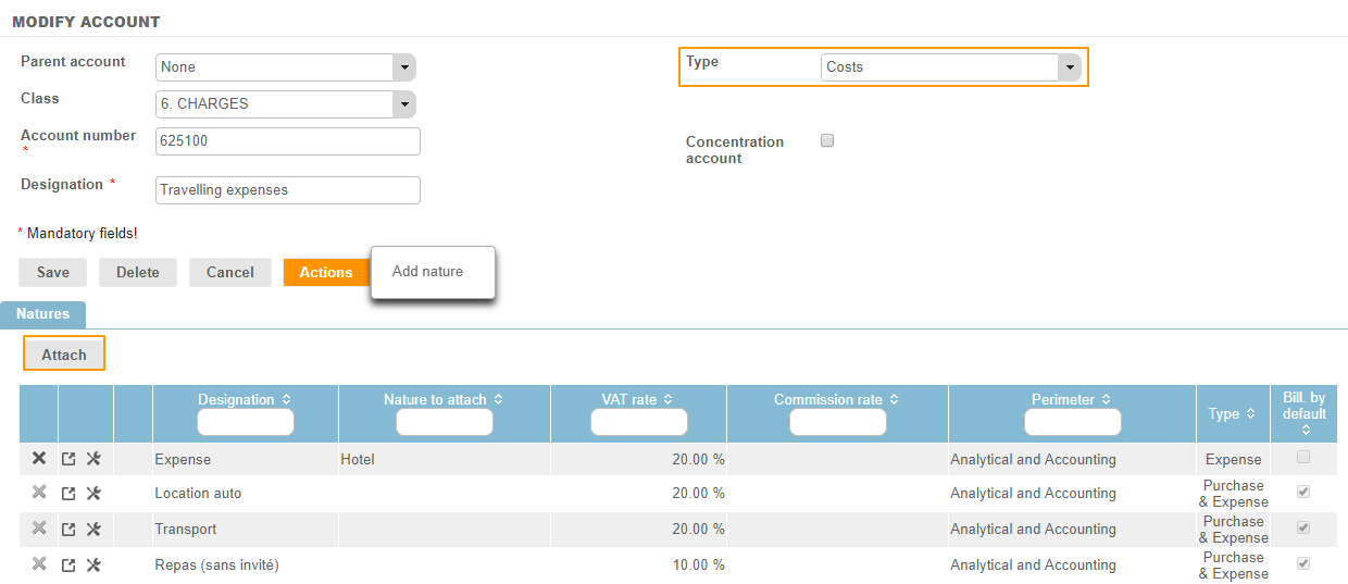 Attaching a Nature of purchase to an account can be done directly from the Configuration menu > Purchases section > Natures> Nature of purchase sheet.