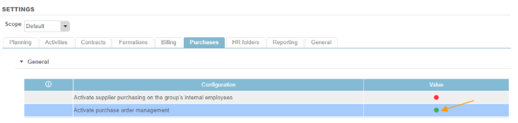 The “supplier” property is mandatory when creating any purchase when purchase order management is active in your environment. To activate purchase order management, go to Settings > Purchases: