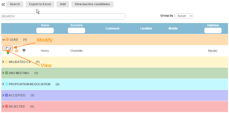 The candidate profile created appear in the "manage candidate profiles" tab, and can be edited or displayed by clicking on the corresponding icons to the left of the table.