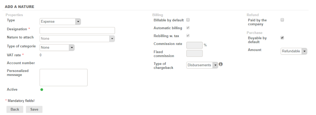 When Creating/Modifying a Purchase Nature/Expense Category, if you choose the Disbursement Type, we will no longer have access to certain settings (VAT rates, Commission rates, Fixed Commissions, Account numbers, Recoverable VAT) and the “Automatic Billing” and “Billable by Default” options will be selected by default.