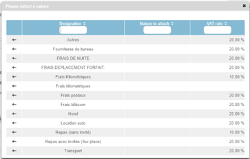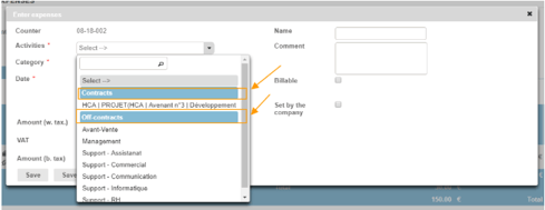 When an expense entry is created, and once the contract with the specific Expense Categories has been created, the selectlist will contain: