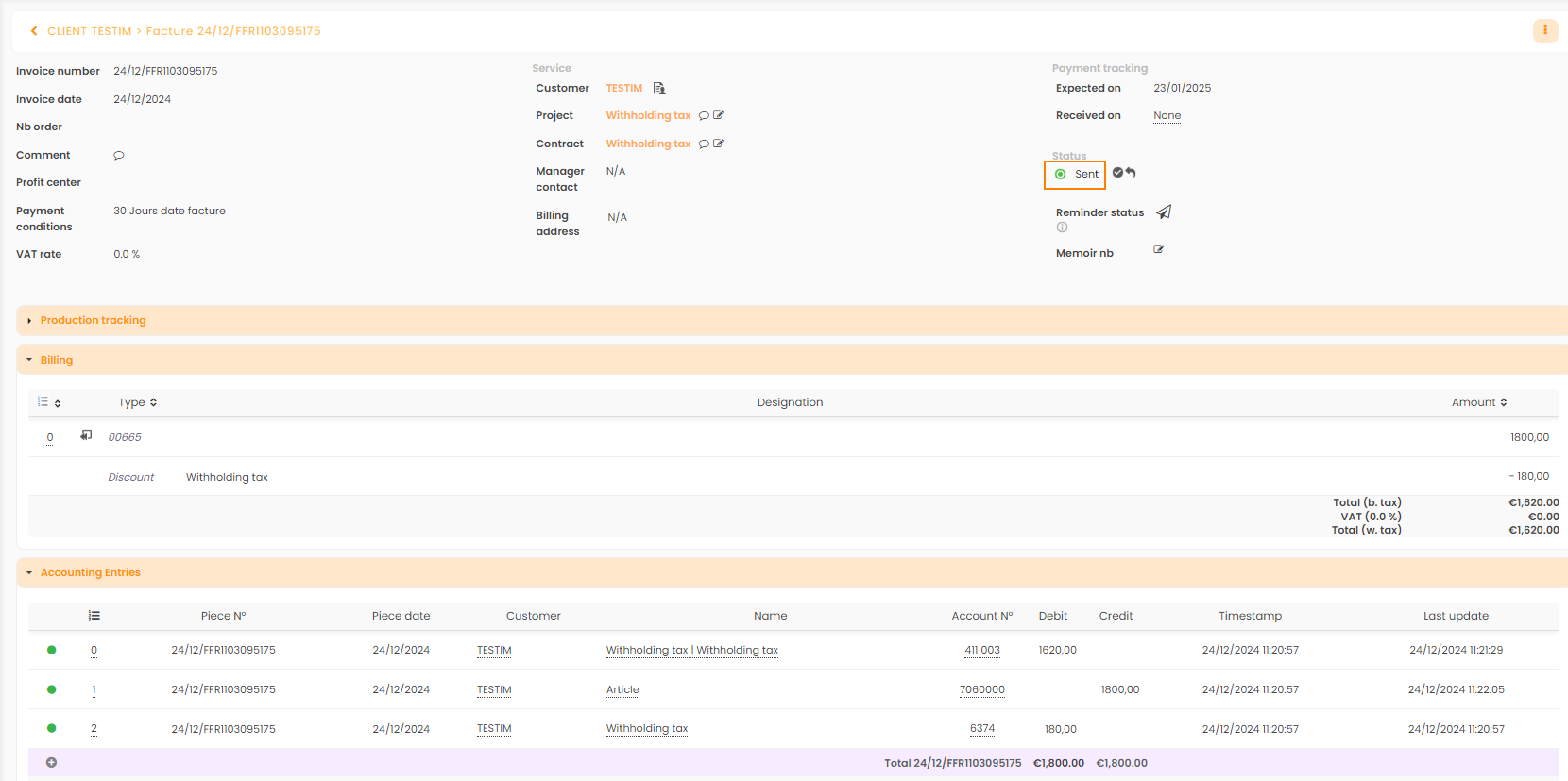 , the accounting entry will be generated with the Withholding tax account broken down.