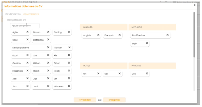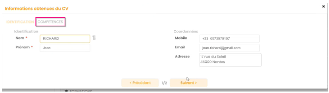 - Fitnet Manager automatically identifies contact information and the skills on the CV and transcribes them in 2 tabs.