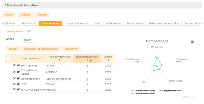 Aftre clicking Save button, the employee/candidate is added and all the identified skills appear in the employee's page. Fitnet Manager also offers the possibility to aess the level of expertise in a skill.