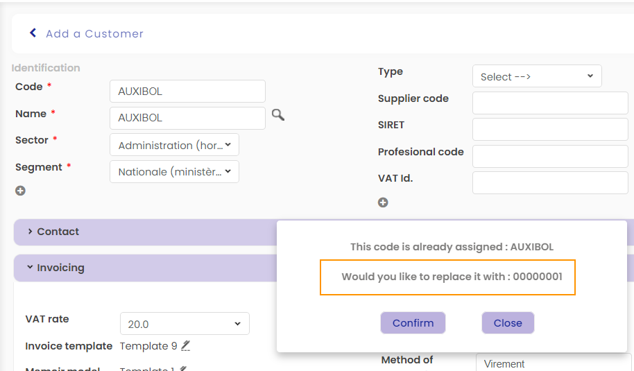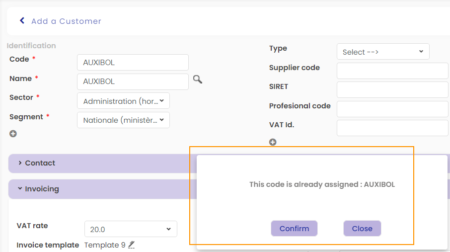 - If the 'Automatic Generation of Client Code' parameter is disabled, then, in case of a duplicate, a warning message appears but it is still possible to create a prospect/client with the same code as another existing prospect/client