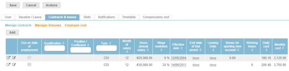 he employee screen contains a specific tab called “Contracts & bonus” which is generated automatically from the addition of an employment contract or bonus from the “Actions” button of the employee module.