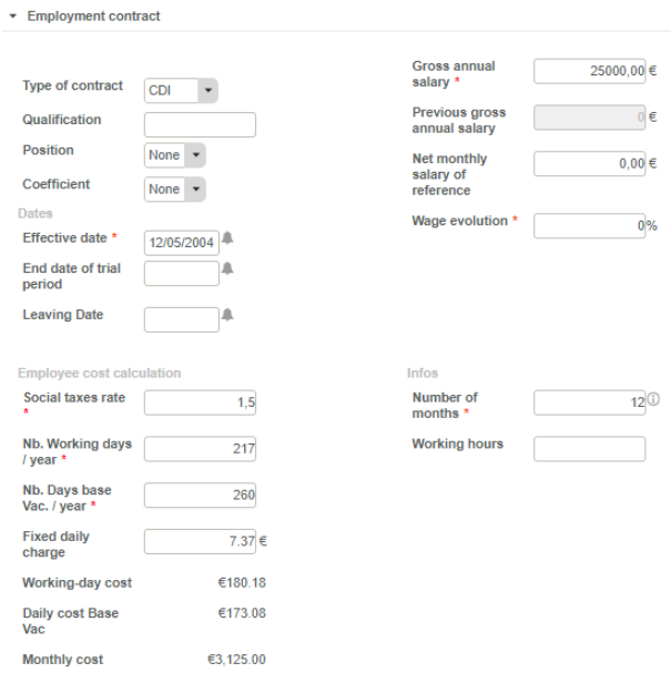 The employment contract allows you to configure the true employee cost calculation by filling in: