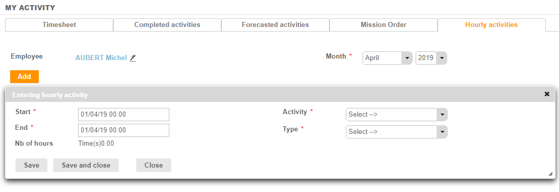 Via the Add button, the employee enters the elements that define his past hours, intervention by intervention: