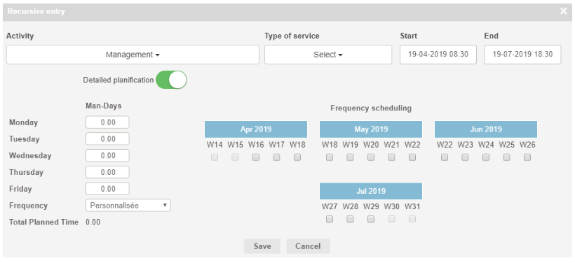 In Detailed Planning mode, you have to define in man days the time spent on the working days of the week.