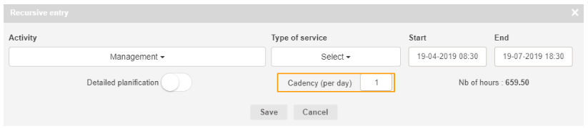 Recursive entry allows you to enter your times in the current month if they are recurring. Click on Recursive entry: an entry window opens, you must fill in: