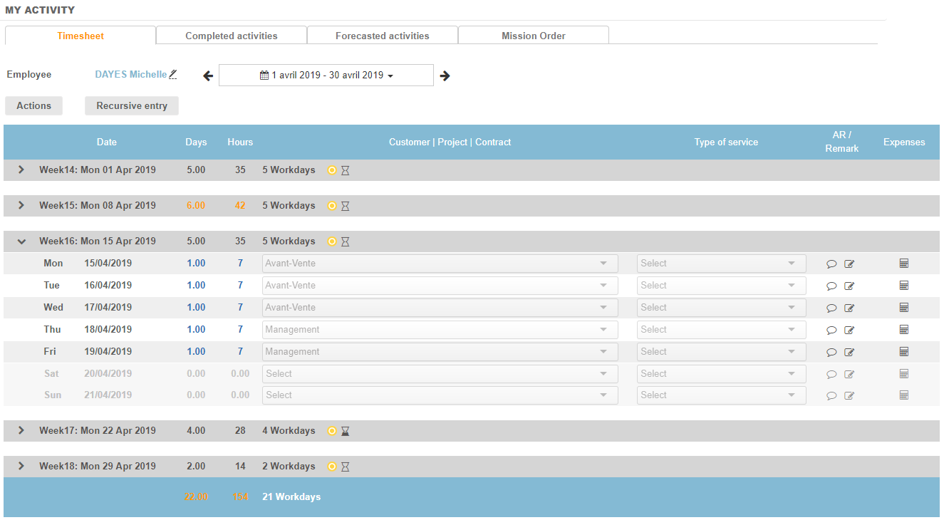 The Timesheet allows employees to enter the time they have spent on activities. The "Timesheet" tab have the same features as the "Completed activities" tab ; only the display is different.