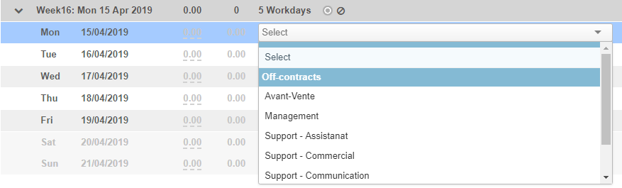 You can entry the time spent from this timesheet. You will be able to select the activity for each line by choosing from the drop-down list: off-contract activity or contract + type of service. This depends on the choice of settings for the selection of the type of service.