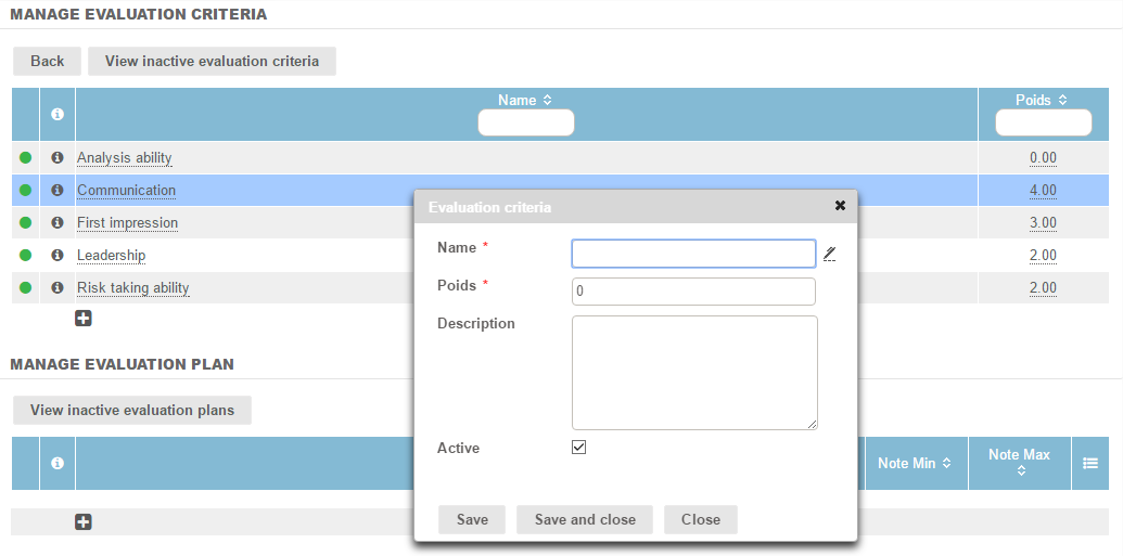 This Configuration module enables pre-registration of a list of criteria for the evaluation plan attributing a "Weight" for calculation to each "Criteria". The mandatory fields for entering an assessment criteria are: the caption and the weight, which represent the default value for calculating the weighted score. A description can also be added, and the criteria can be given an active or inactive status.
