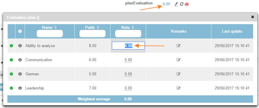 By clicking on the score, by default 0.00, the evaluation criteria corresponding to the chosen evaluation plan are displayed in a table. For each criteria, the score given to the candidate must be filled in and the system calculates the weighted average for this plan.