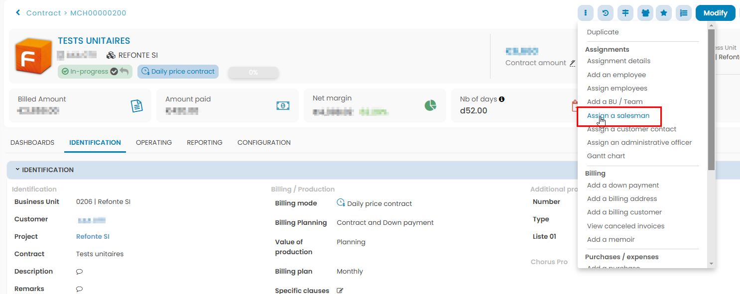 To assign a salesman to a contract, you have to click on Actions > Assign a salesman: