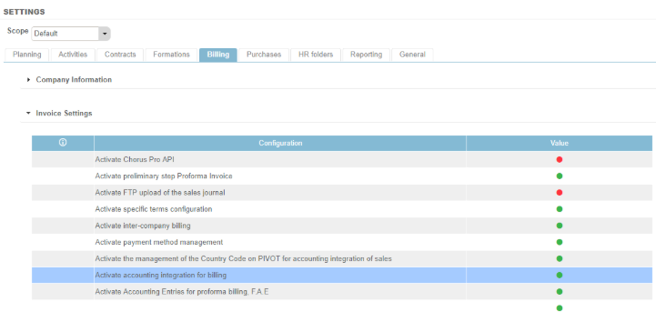 To activate the accounting integration of your SALES, go to Settings > Billing tab > Invoice Settings pane.