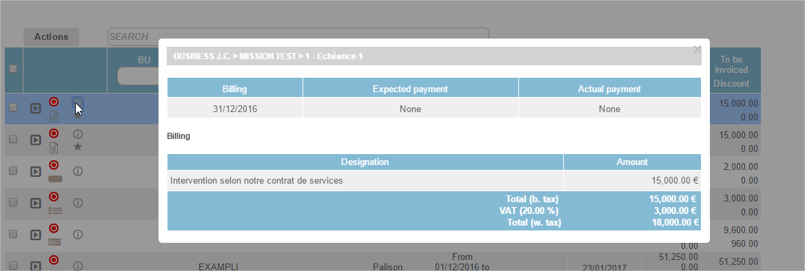 In all cases, when the mode is selected "Invoicing Schedule = Due dates": invoicing deadlines will then have been created manually by entering the date and the amount due.
