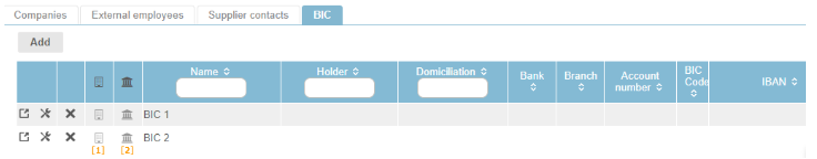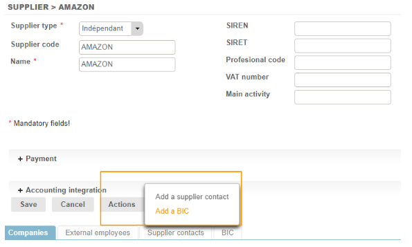 A BIC can be added from the “Actions” button of the Supplier screen.