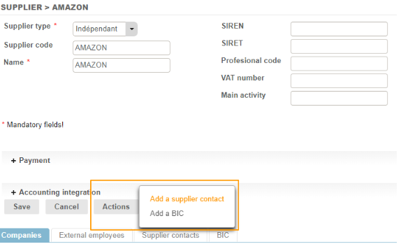 To create a supplier contact, go to the supplier’s sheet and click on the Actions > Add a supplier contact.