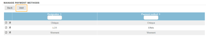 Click on “Add” to create a payment method. All payment methods that have been specified are found in the table.