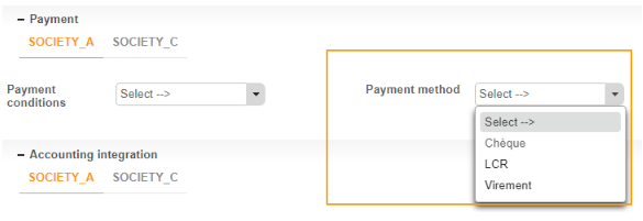 Once you have entered the payment methods, they will be available from the drop-down menu (which is activated by the required pre-configuration) and which is found in the Supplier screen.