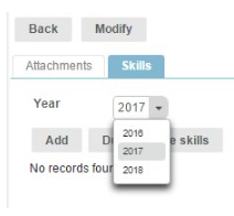 To assign skills to a candidate, enter the candidate file by clicking on the "Modify" icon in the candidate line. Below the candidate file, in the "Skills" tab, select the year in the drop-down menu or enter the desired year in the field.