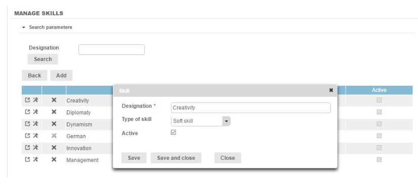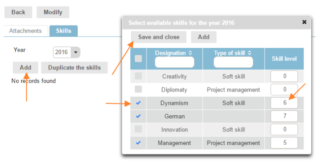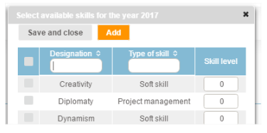 Then click on the "Add" icon. A window will open with the pre-registered skills. To select a skill, tick the box to the left of the skill line and state a skill level, then click on the "Save and close" button.