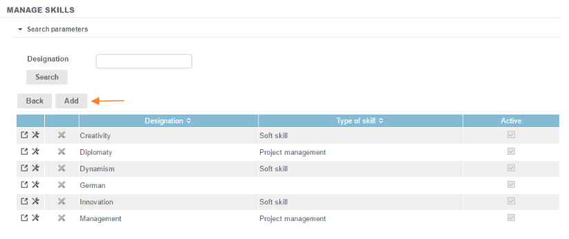 The steps are similar to those explained above. In this case, to add a type of skill, only the "designation" field must be filled out.