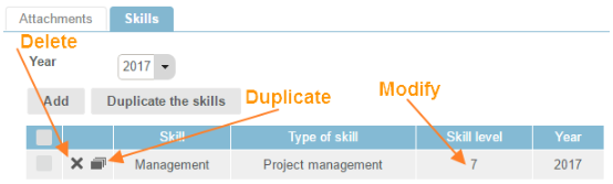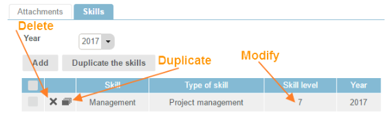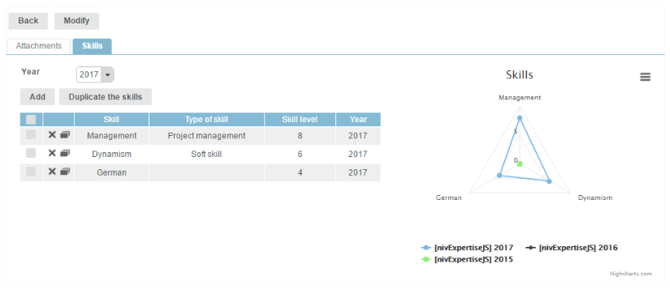 After selecting the skills for a candidate, the list of skills, the type, the skill level and the year are displayed in a table and on a graph. The skills can be copied, changed or deleted directly in this window, by clicking on the different icons: "delete", "skill level", "copy".