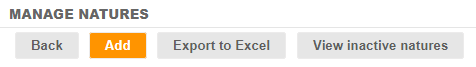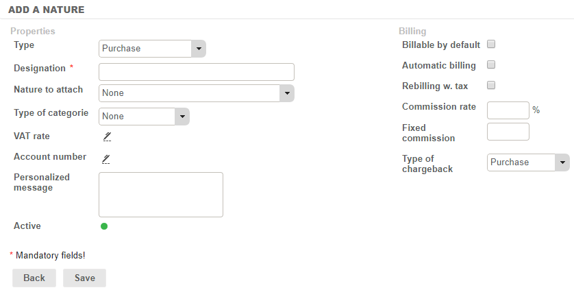 By clicking on the button Add, we can configure a new nature of purchase. We get to the following screen: