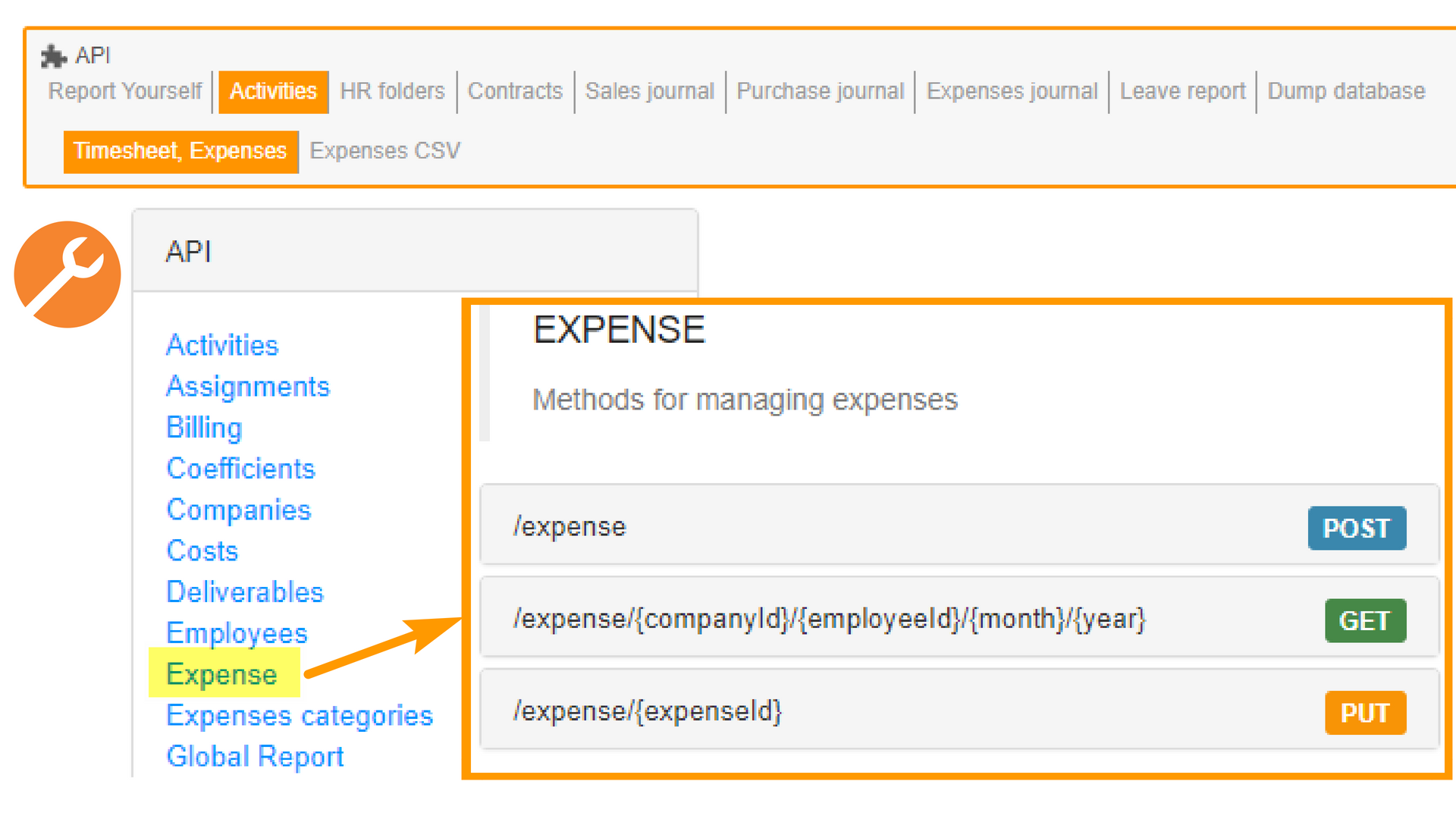 Get to Configuration module > API > Activities > Timesheet, Expenses, Vacations / Leaves, and click on "Expense".
